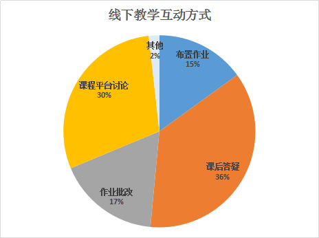 大部分同学选择了课后答疑和课程平台讨论两种方式进行线下教学互动(36%的同学认为课后答疑互动效果较好,30%的同学认为课程平台讨论互动效果较好):