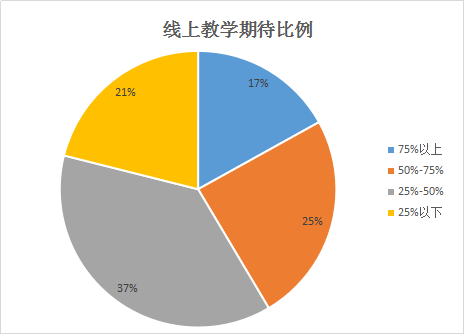 如果按照线上与课堂相结合的方式进行教学,那么学生预期的线上教学的比例占课堂教学的比例是多少呢?37%的同学认为线上教学占比为25%-50%合适,25%的同学们认为比例为50%-75%合适,21%的同学们觉得占25%以下合适,仅有17%的同学认为占75%以上合适: