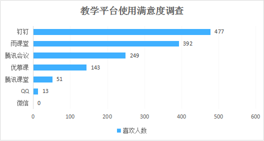 针对公司教师使用较多的七种教学平台我们做了一个满意度调查,学生喜欢程度由高到低分别是:钉钉,雨课堂,腾讯会议,优慕课,腾讯课堂,QQ,微信(无人选择)。