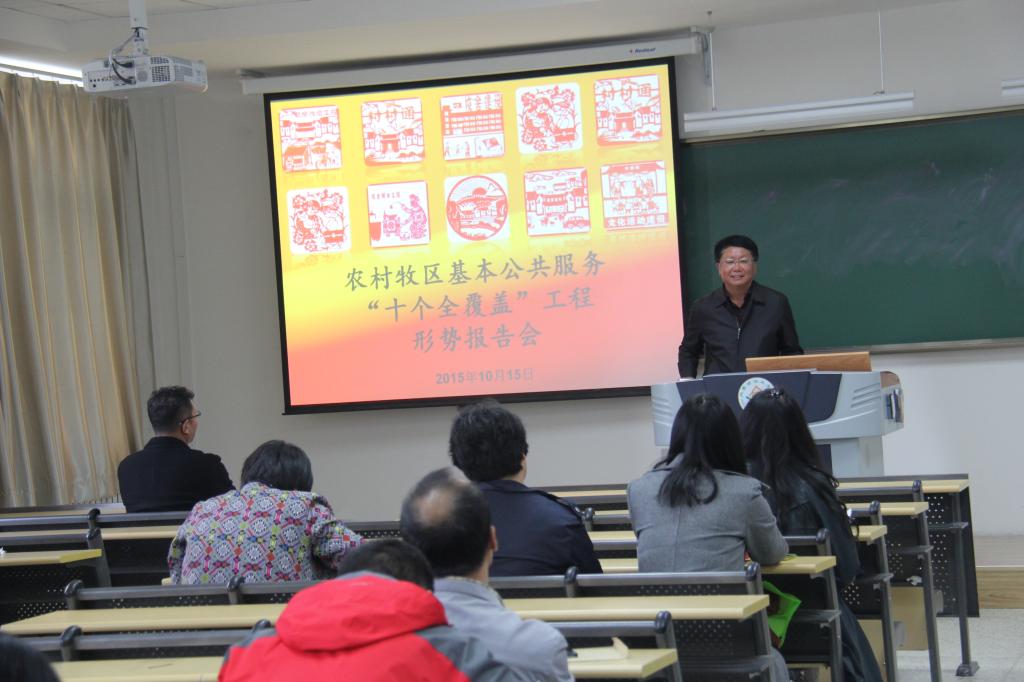 根据公司党委的部署和要求,公司10月15日下午在南教A218召开专题学习会,公司党委书记林宝结合学校组织观摩考察包头市东河区、乌兰察布市部分乡镇“十个全覆盖”工程建设情况的所见所闻,作了题为《农村牧区基本公共服务“十个全覆盖”工程形势报告》的专题报告,学习会由公司党委副书记任燕刚主持,学院全体教职工参加了学习会。