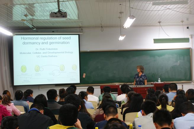 Dr.RuthFinkelstein系统介绍了美国加州大学生命科学教育与研究情况,与植物分子生物学实验室探讨了合作课题,为实验室师生讲解了植物生物技术研究的相关方法,在全校范围内做了题为“AbscisicAcid Signaling Networks in Arabidopsis Seeds and Seedlings”、“Modulators of theAbscisic Acid Core Signaling Pathway”和“Hormonal regulation of seed dormancyand germination”的系列学术报告。
