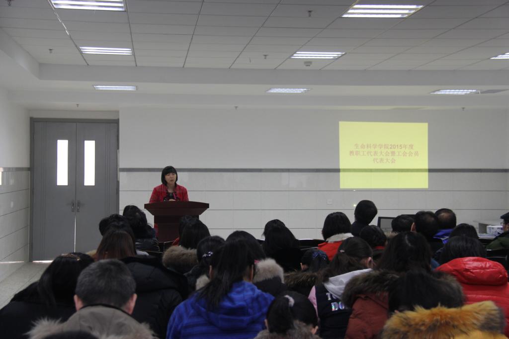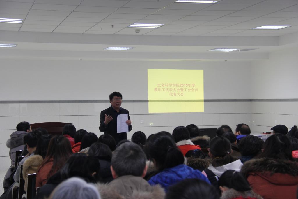 1月15日上午9:30,AG真人国际2015年教职工代表大会暨工会会员代表大会在生科大楼隆重召开。公司党政领导林宝、李国婧、任燕刚等出席大会,学院各部门、各系的教师代表参加了此次大会。大会由公司工会主席邵世勤主持。