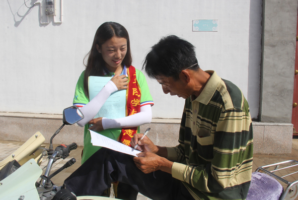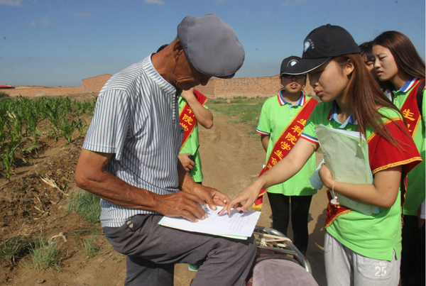 上午,社会实践小分队的成员们以基地为中心,沿路对村民进行了调查访问,并跟老乡们宣传国家的惠农政策及医疗知识。大家从“十个全覆盖”的直接受益者身上了解民生工程的实施进度和影响,新修的柏油马路、全新的农田灌溉管网、设施齐全的文化室令小什拉乌素村的面貌焕然一新,同时也提高了村民的生活质量。在走访过程中,志愿者们发现大多数村民对于肿瘤的防治知之甚少,为了普及医疗保健知识,队员们将关于肿瘤预防与治疗的宣传单分发给群众,并且耐心地给予解释。村里新建的农田灌溉管网设施给农民带来了福音,过去需要整夜等待轮流浇地的日子已不复存在,运用灌溉设备每亩地只需要一两个小时就可以全部完成作业,大大地提高了农田灌溉效率。
