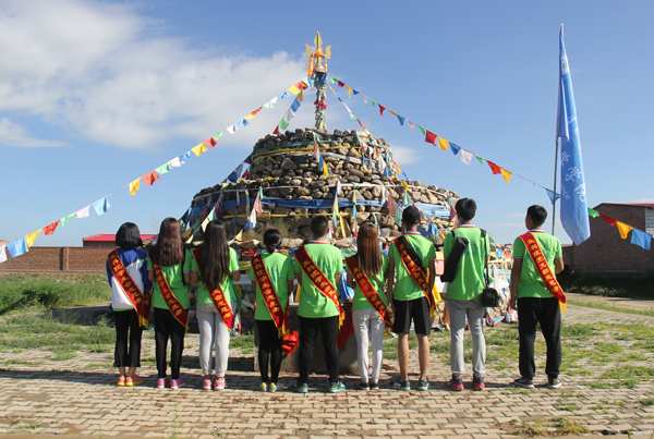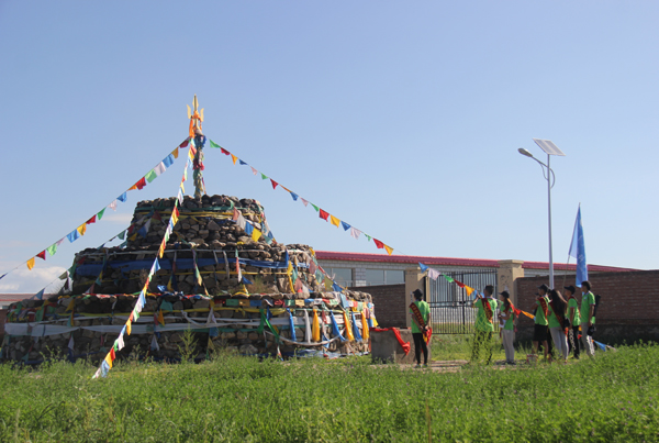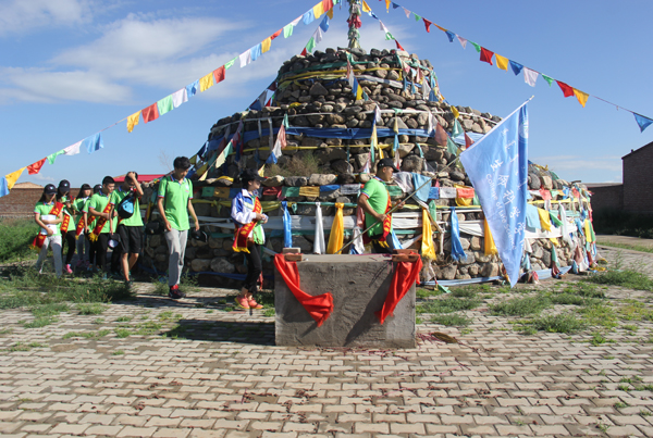 雨后的村庄,空气格外清新,志愿者们走在崭新的柏油马路上,向往着神圣的地带—敖包进发。在老乡的指引下,经过半个多小时的寻觅,队员们终于找到了在牧民心目中,象征神在其位,世袭传颂的敖包。在敖包南面五十米的地方矗立着成吉思汗的雕塑,周围彩旗飘扬,绿荫丛生。雕像与敖包在晨光下交相辉映。听老乡们介绍,敖包上插的苏德是成吉思汗、忽必烈用过的刀枪,上面镌刻着他们开疆扩土的辉煌,而把哈达系在苏德上,则是为了表达子孙后代对先辈们的敬仰。志愿者们虔诚地围着敖包走了三圈,并在上面放了一块石头,默默地许下愿望,保佑家人平安健康。最后,公司实践队员在敖包前合影留念。
