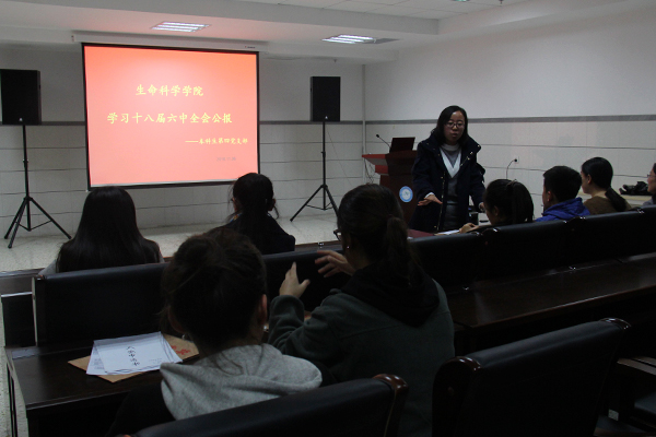11月2日、6日、8日,学院分别组织召开了学生干部、团支书和学生党员的十八届六中全会公报专题学习会。学习会后,学生干部郭贺表示,十八届六中全会体现了党中央坚定推进全面从严治党,加强党的建设,坚持思想建党和制度建党紧密结合,使党内政治生活展现了新气象,赢得了党心民心。作为一名学生干部、学生党员,应该严于律己,自觉用合格党员的标准要求自己,规范自己,勇于担责,为同学做出榜样示范的作用,用实际行动去感染同学、引导同学。13级生物科学专业学生党员米立媛表示,作为一名在校大学生,要在学好专业知识的基础上,坚定理想信念,牢记青年使命,明确青年担当,勇担重任,乐于奉献,为实现中华民族伟大复兴的“中国梦”贡献自己的一份微薄之力。