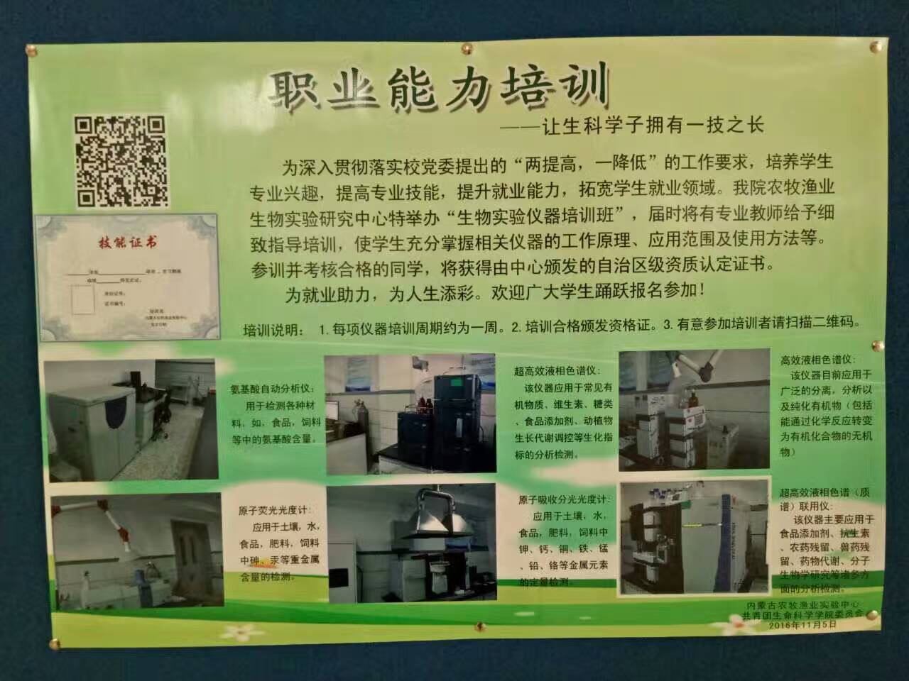 内蒙古农牧渔业生物实验中心是为公司教师的科研、博士、硕士论文提供测试分析服务的实验研究机构,也是本科学生教学、实习、培训的基地。中心通过开设培训班,邀请资深实验员对学生言传身教,将实验仪器的各项操作,维护方法进行细致讲解,使学生通过实践操作,在增加专业知识储备的同时掌握众多技术方法,为自己的就业之路拓宽发展方向,培训合格的学生也将获得自治区级资质认证书。