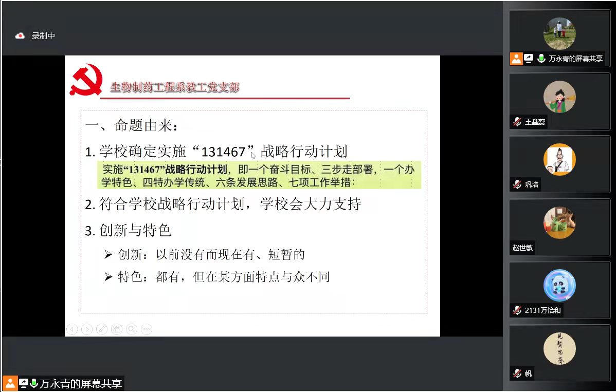 5月25日晚7点,AG真人国际生物制药工程系教工党支部在腾讯会议召开《聚焦学校战略计划·打造生物制药特色》建设最强党支部系列主题会议的第一场,支部全体党员同志出席。