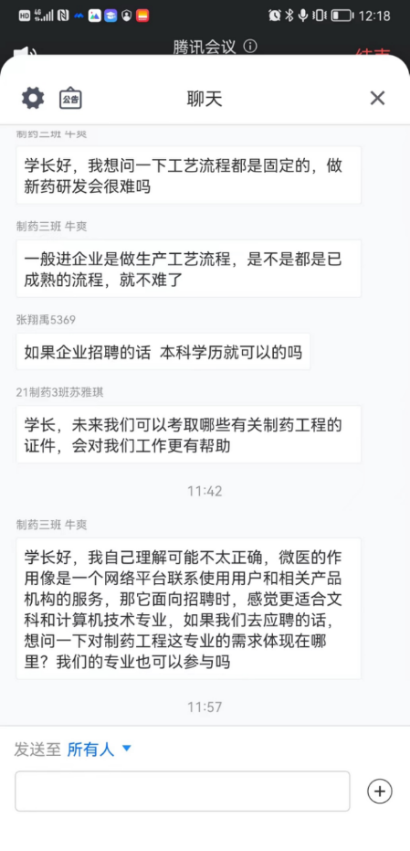 21级制药工程专业学生与两位员工进行了热烈讨论,大家从不同的方面进一步了解了制药工程专业,专业就业空间广阔,毕业后可到制药工程领域相关的生产企业、营销企业、科研院所、药品监督管理部门等企、事业单位从事药品生产、管理、营销、检验监督和研发等工作。也适于报考生物技术、药学及相关专业的研究生。也可以像员工李浩一样,成为一名微医,这让同学们对美好未来充满了信心!巩培老师对本次分享会进行了总结,感谢两位员工的经验分享,他们的分享有助于开拓制药工程专业的学生对专业认识的视野。巩老师同时强调了技术创新在制药行业发展中的作用,鼓励同学们参与创新创业活动,树立起创新意识。
