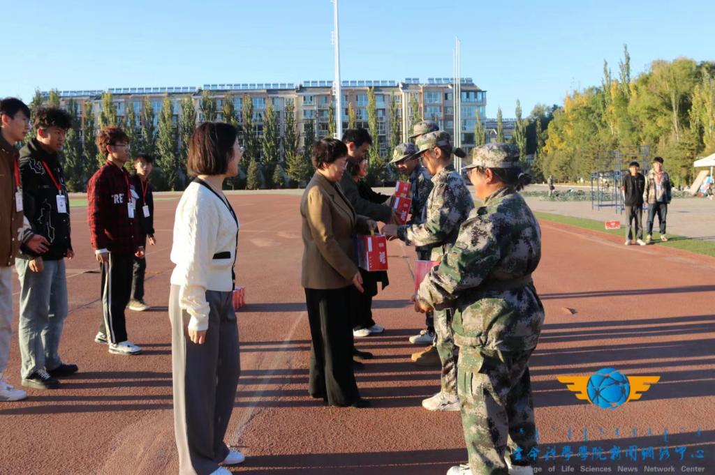 经过教官的整队,新生神采奕奕地站在老师们面前,他们精神抖擞、身姿挺拔,充分展现了生科学子肯吃苦、敢奋斗、勇争先的精神风貌。张星杰书记对参训的2023级学生的精神面貌、纪律观念、集体意识给予了鼓励和肯定。她指出,此次军训即将接近尾声,希望全体参训同学笃行不怠、一往无前,将前阶段军事训练中所涵养的精气神、所磨炼的斗志、所积蓄的力量迸发出来,高质量完成入学第一课。为感谢军训教官的辛勤工作,张星杰书记代表学院为教官代表颁发了慰问品,并与各位领导、辅导员教师一道为军训新生送上一份心意。