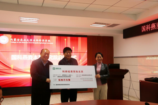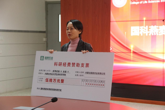 接下来,由内蒙古国麦农业公司李祯副总裁宣布,代表内蒙古国麦公司将50万元科研启动经费投入国科燕麦本草研究院,并由张子义副经理代表学院接收捐赠,张子义副经理将此科研启动经费移交给国科燕麦本草研究院常务副经理韩冰教授。韩冰教授表示,研究院的成立是对学院科研工作的肯定,极大了鼓舞了科研工作者的信心,相信在双方的共同努力下,研究院必定会取得更高的成就。